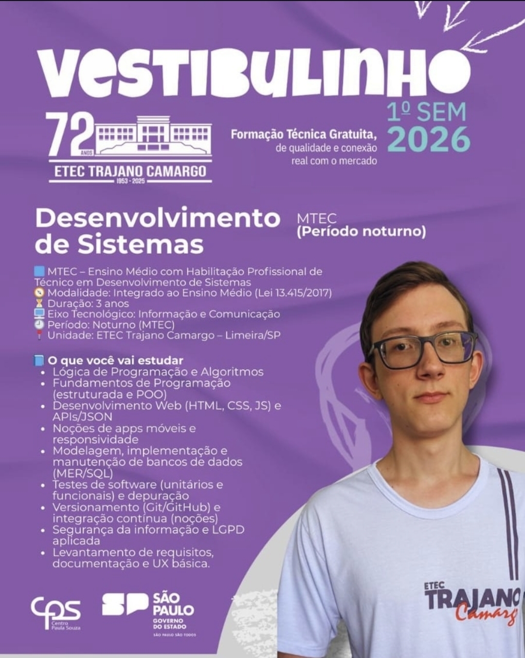 O curso técnico de Desenvolvimento de Sistemas da Etec Trajano Camargo está com inscrições abertas para o Vestibulinho 1º semestre de 2026!