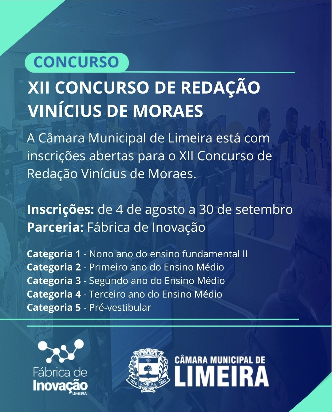A Câmara Municipal de Limeira está com inscrições abertas para o XII Concurso de Redação Vinícius de Moraes.