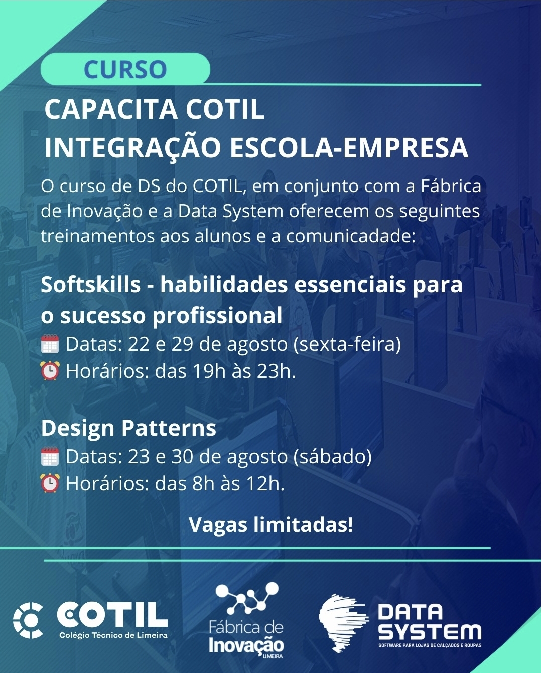O curso de DS do COTIL, em conjunto com a Fábrica de Inovação e a Data System oferecem os seguintes treinamentos aos alunos e a comunicadade: